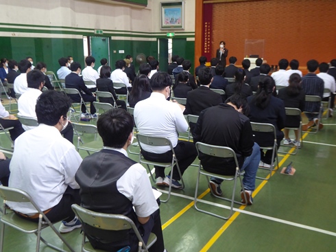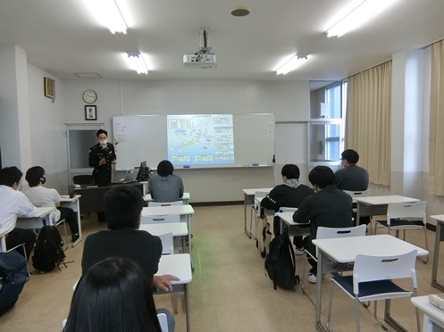 春季集中講座の初日。2年生の学生たちは、自衛隊より本校までお越しいただいた自衛官の方から「災害に備えて」というテーマでの貴重な話を聞かせていただきました。